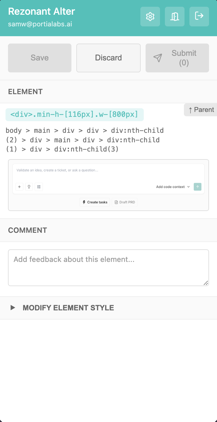 Rezonant Alter lets you capture feedback on a live product as you see it. Annotate UI, describe behaviour, and submit input straight into Rezonant, where it's used alongside technical context to shape better work.